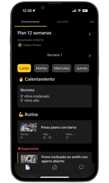 Te daremos entrenamientos personalizados, videos detallados para perfeccionar cada ejercicio y revisión de tus movimientos para garantizar tu progreso y evitar lesiones.